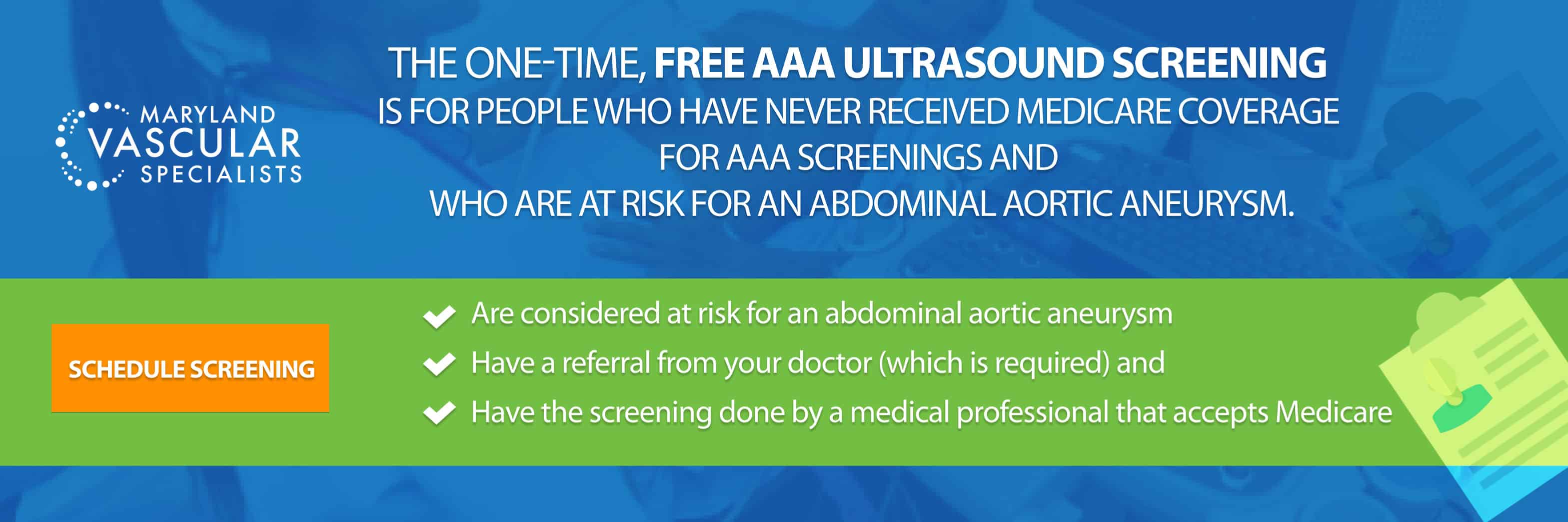 The one-time, FREE AAA ultrasound screening is for people who have never received Medicare coverage for AAA screenings and who are at risk for an abdominal aortic aneurysm. You will not have to pay anything for having the abdominal aortic aneurysm screening done if you:
